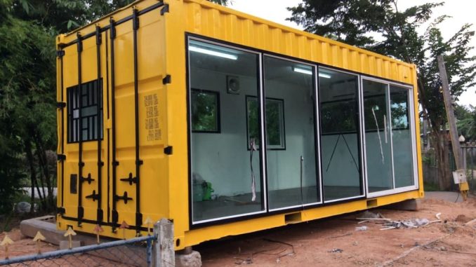 Kontainer yang sudah dimodifikasi menjadi kantor proyek lengkap dengan pintu, jendela, AC, dan instalasi listrik.